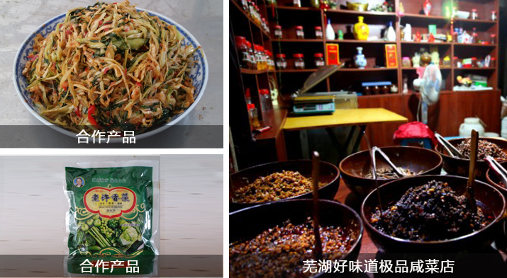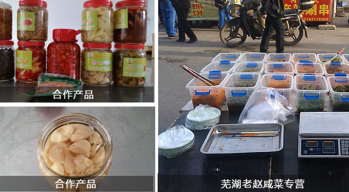 芜湖老赵咸菜专营店是一家私营店,该客户家的腌制品全部是从我们家供应的。该老板说我们家的咸制品相比市场上的其他产品在口味和质量上好很多,而且价格也合理。我们有什么新品都会给他们先品尝后购买合作,老板对我们的产品很满意!