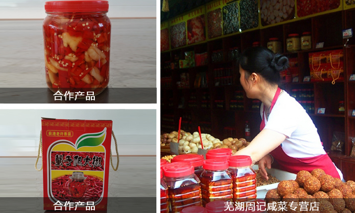 芜湖周记咸菜专营店是芜湖泰院小区旁的一家私营咸菜店。主要是卖各种特色咸菜,该老板一直想找到一个长期产品供应商,不用为找咸菜货源而烦恼,在朋友的介绍下与我们达成合作,该老板还来我们这儿实地考察了,觉得我们的产品正是他所需要的,无论是质量还是口味都是很好,之后我们合作了!