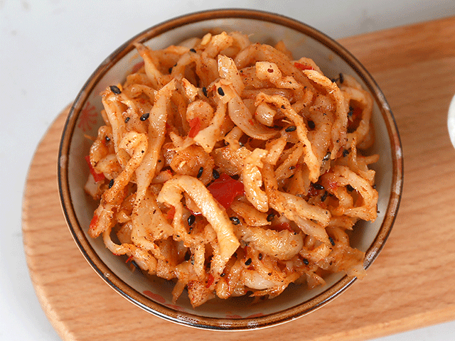 香辣莴笋制法:莴笋,刮去皮肤,冲洗干净,先切成长条,再切成两半,再切成长条。将生菜放入碗中,加一勺盐混合均匀,腌制10分钟以除去水分。将腌好的莴笋放在纱布上,包好晾干。这样,莴苣质地更脆。将油倒入锅中,倒入蒜末,翻炒小米胡椒粉,散发出香气。倒入无盐生菜,在高温下炸1分钟,然后倒入一匙鱼露。均匀地从锅中翻炒,这是当季美味佳肴。