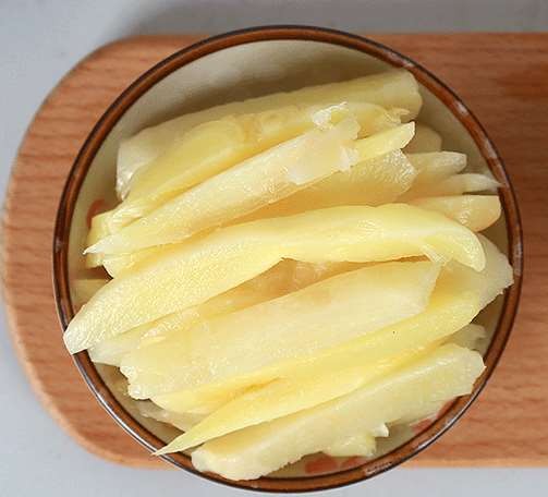 要注意的是,如需腌制其他风味的老许嫩姜,将腌制好的腌制生姜浸泡在水中(除去部分咸味),然后腌制所需风味。如糖醋姜片、白糖姜片、桂花姜片等。