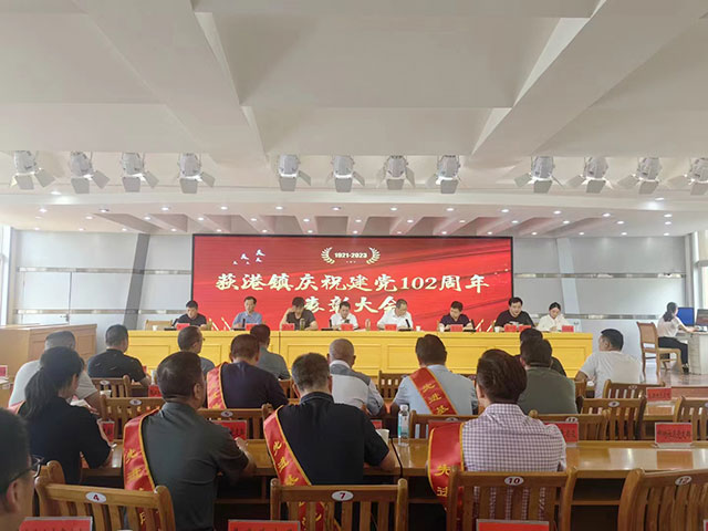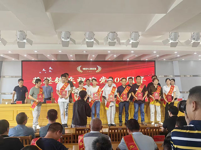 荻港镇庆祝建党102周年表彰大会,荻港老许香菜董事长,非遗传承人许成华(右五),荣获党员荣誉接受镇领导颁发证书现场。
