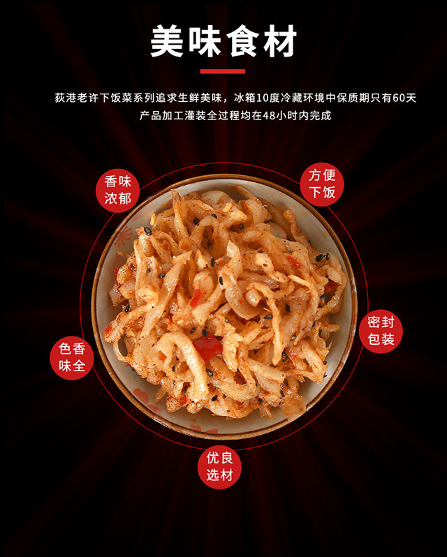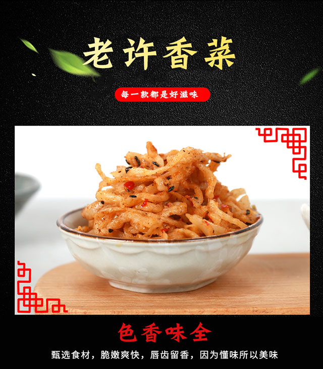 喜欢吃咸菜的朋友一定不要错过这一款香辣萝卜条,精选新鲜萝卜,经过多到工序制成,健康美味,不妨到繁昌县荻港老许香菜有限责任公司直营店购买!